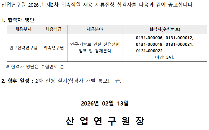 2026년 제2차 위촉직 채용 1차 전형(서류심사) 합격자 공고