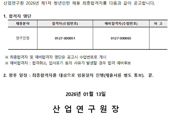 2026년 제1차 청년인턴 채용 최종합격자 공고 2026-01-13