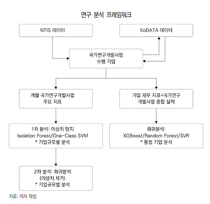 분석 대상은 국가과학기술지식정보서비스(National Science & Technology Information Service, NTIS)에서 대기업 295개사, 중견기업 300개사, 중소기업 308개사 등 총 903개 기업을 선정하여 수행한 국가연구개발사업에 대한 정보를 데이터화하였으며, 기업별로는 NTIS 과제 데이터와 KoDATA 재무 정보를 수집하여 정량적 데이터셋을 구축하였다.